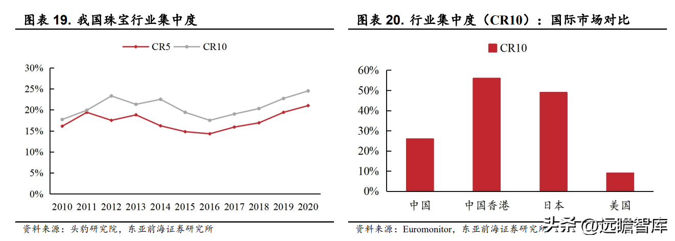 近两年在疫情挑战下,尾部品牌加速出清,而头部品牌依托品牌、渠道、运营等优势实现了逆势扩张。根据头豹研究院、欧睿咨询数据,2020 年中国大陆珠宝市场 CR10 约 25%,横向比较居民文化传统及消费习惯相似的中国香港(56%)、日本市场 (49%),行业向头部集中仍有较大空间。