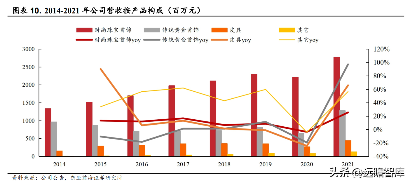 2021 年公司时尚珠宝首饰(主要为以件计价珠宝)/传统黄金首饰(主要为以克重计价珠宝)/皮具/其它业务收入分别达 27.76 亿元/12.84 亿元/4.45 亿元/1.32 亿元,占营收比重分别约 60%/27%/10%/3%;从收入增速来看,2014-2021 年七年间三类主要业务收入年复合增速分别为 11%/4%/16%,其中时尚珠宝首饰业务增速较为稳定。
