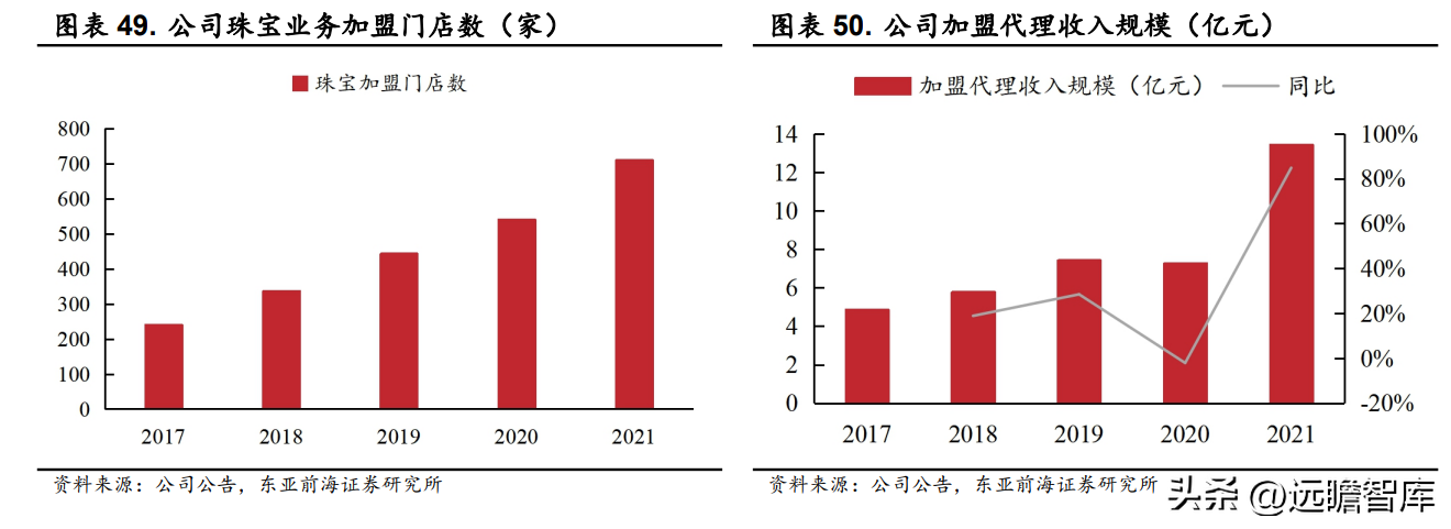 门店从新开业运营至成熟需要一年左右培育期,目前公司珠宝业务加盟渠道高速扩张已逐步进入成果兑现期,2019/2020/2021 年珠宝业务加盟门店分别达 444/541/711 家,年内分别净增加 107/97/170 家。