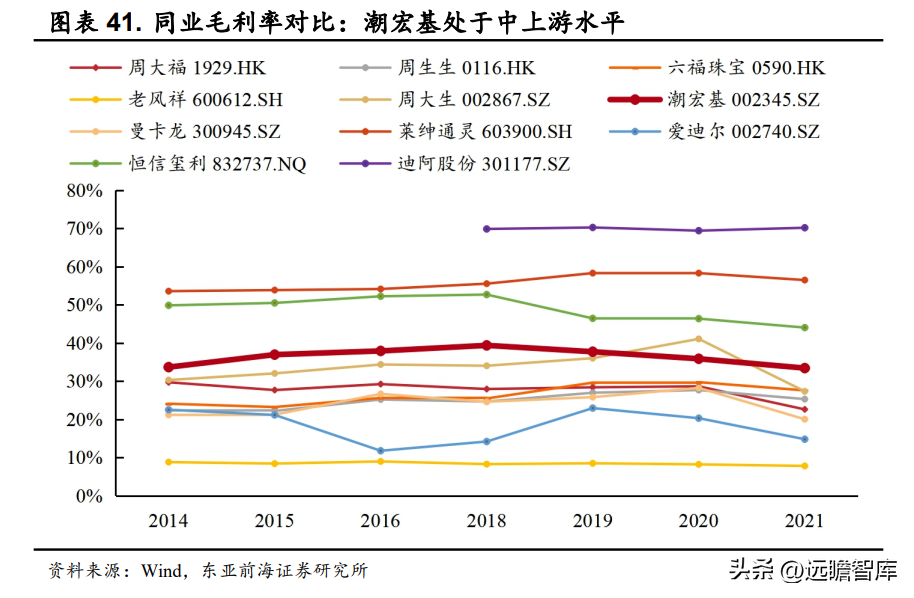 从同业毛利率比较来看,公司毛利率长期处于国内珠宝品牌中上游,2021年整体毛利率达 33%,其中时尚珠宝首饰营收占比约 60%、毛利率显著高于传统珠宝首饰达 38PCT。呈现出较强的品牌溢价能力。