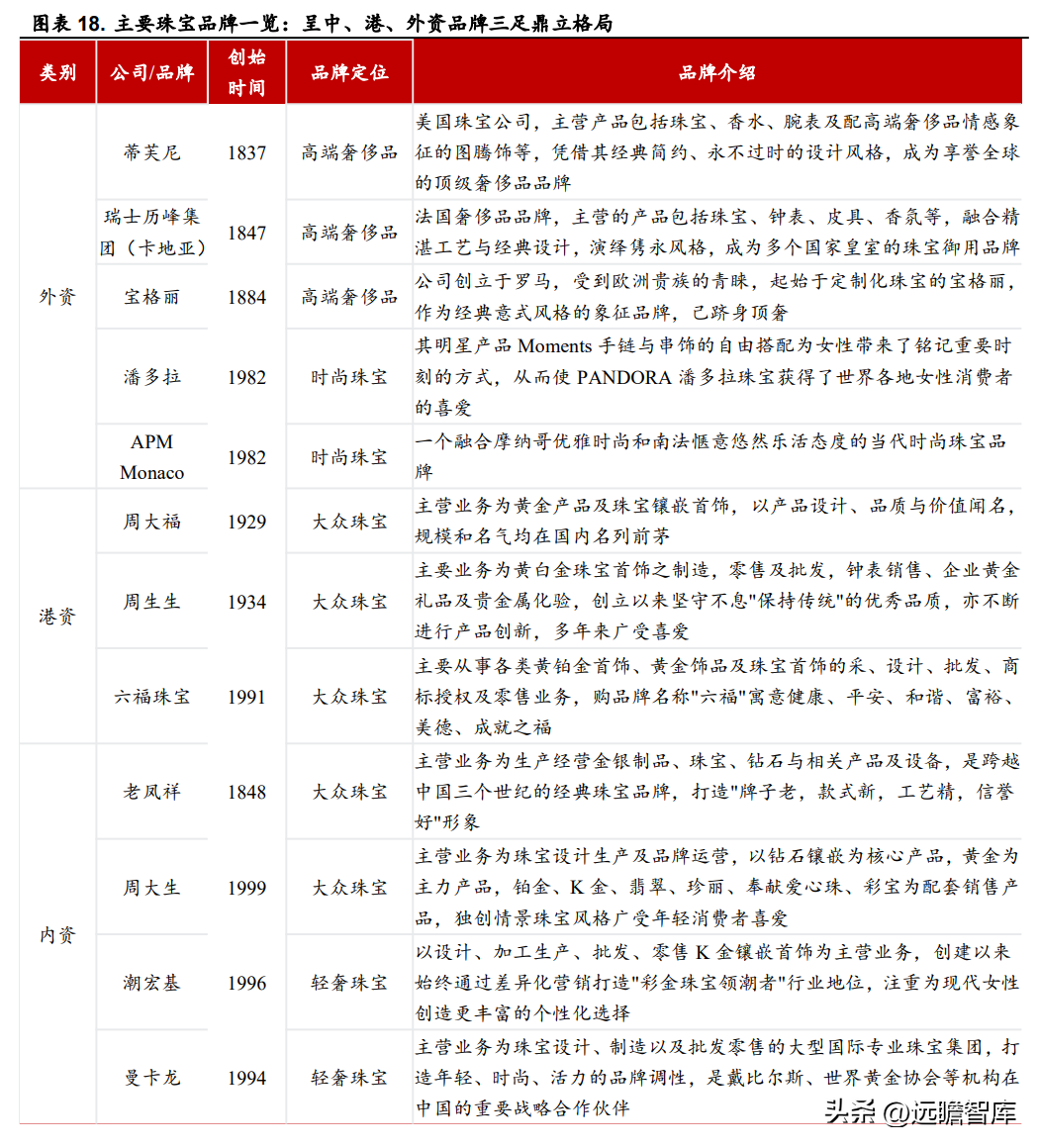 从品牌定位来看,中资、港资、外资品牌差异明显:外资品牌主打高品牌溢价模式,自20 世纪 70 年代起陆续进军我国市场,长期以来占据国内高端镶嵌珠宝市场,并领导全球时尚珠宝市场快速扩张;中资、港资品牌多定位于中高端市场,依托天然文化优势,在黄金市场中占据主导地位,近年来内资中又涌现出一批新兴时尚珠宝品牌,通过品牌定位、营销策划、产品设计等实现差异化竞争、构筑品牌壁垒。