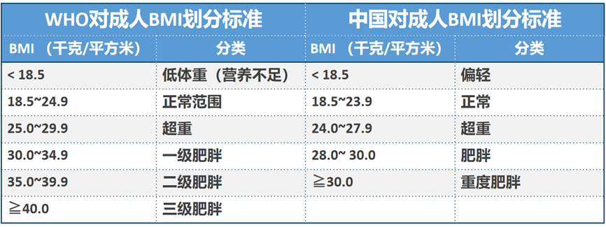 BMI计算公式:体重除以身高的平方,单位(公斤/平方米kg/m2)。例如,一个身高1.70米男性,体重85公斤,简单的计算BMI=85÷1.7÷1.7=29.4 kg/m2 ,这个数值代表什么意义呢?因种族的差异,西方人块头比较大,所以中西方对于BMI的分类标准是有所区别的。