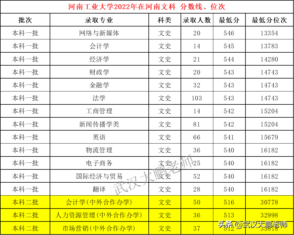 河南工业大2022年在河南文科分数线、位次值河工大在河南文科招生计划500人左右,2022投档线540分、位次16182位,比较稳定。文科专业分差很小,最高分网络与新媒体546分、位次13354位。