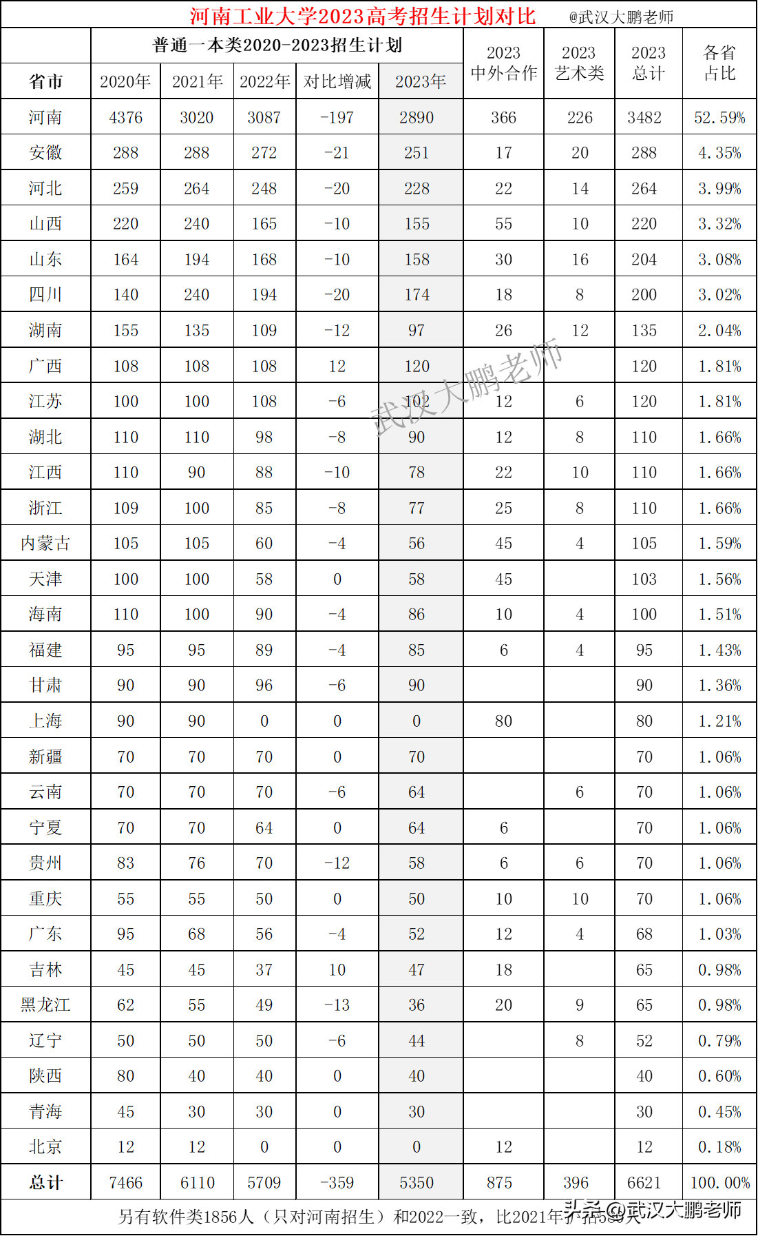 河南工业大学2023年招生计划发布,普通一本类共招5350人、比2022年减招359人、比2021年减招760人;对河南招生计划2890人、比2022年减招197人。