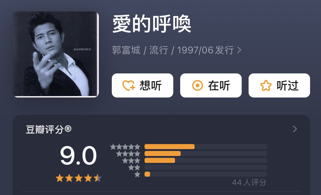 评分最高的专辑是1997年发行的《爱的呼唤》,评分9.0