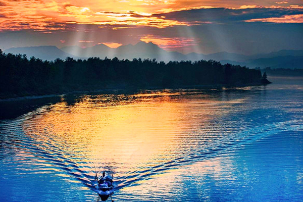 这首诗的第一句很好理解,作者在这里先介绍了事件发生的时间,是夕阳下山的傍晚。此时太阳已经落到了地平线上,所以阳光射到江面,就像是在水面“铺”开来一样。