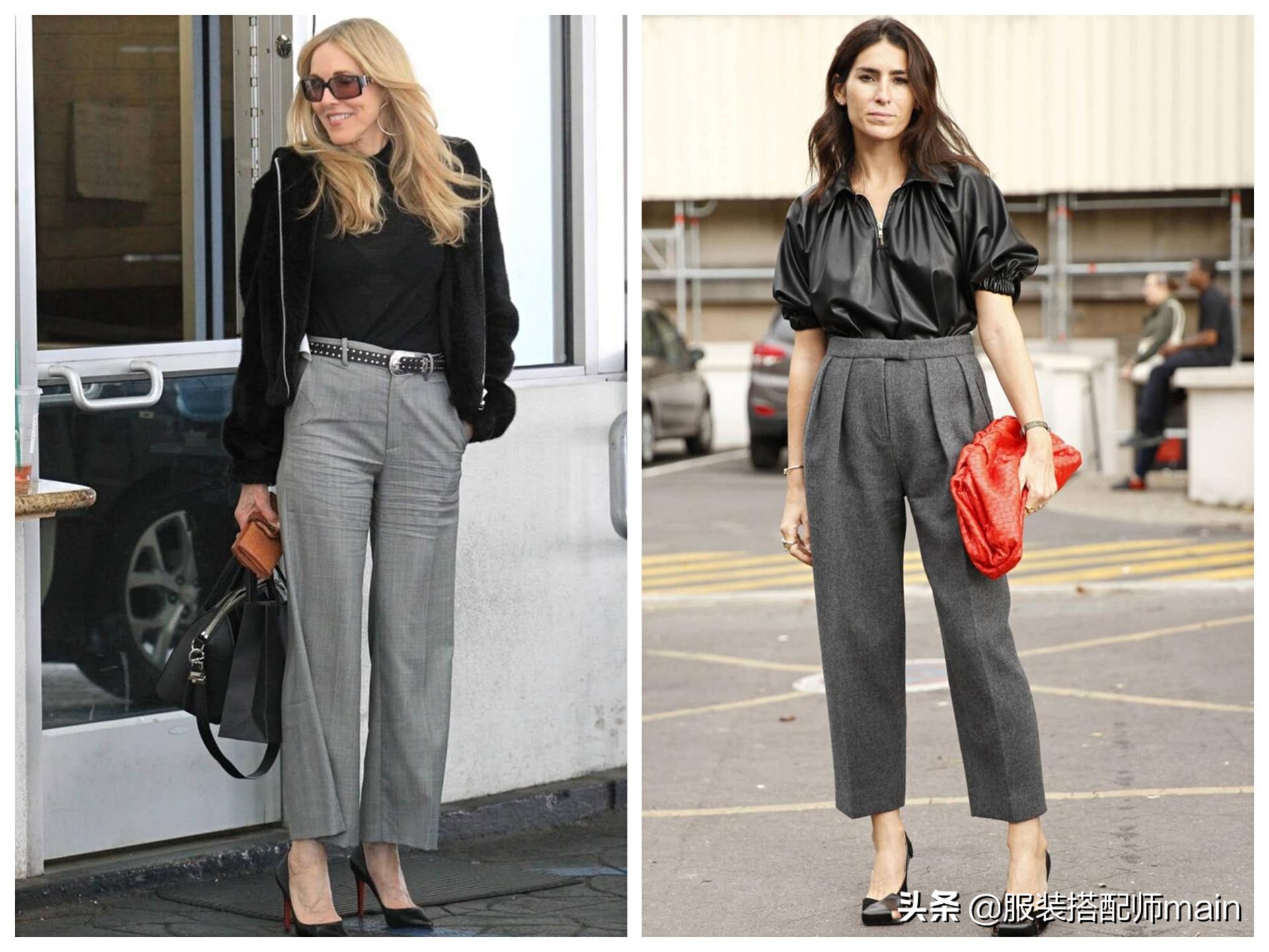 用灰色长裤和黑色上衣搭配需要注意两点,第一,单品搭配必须符合身高和身材的要求,第二,上下衣单品风格必须统一。