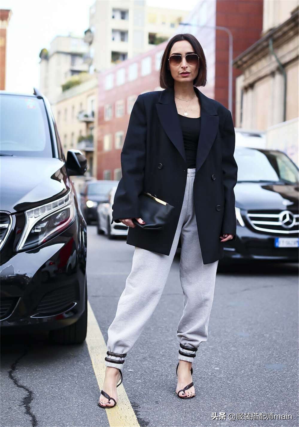 灰色长裤搭配黑色西装,即可以作为日常穿搭又可以作为通勤穿搭。