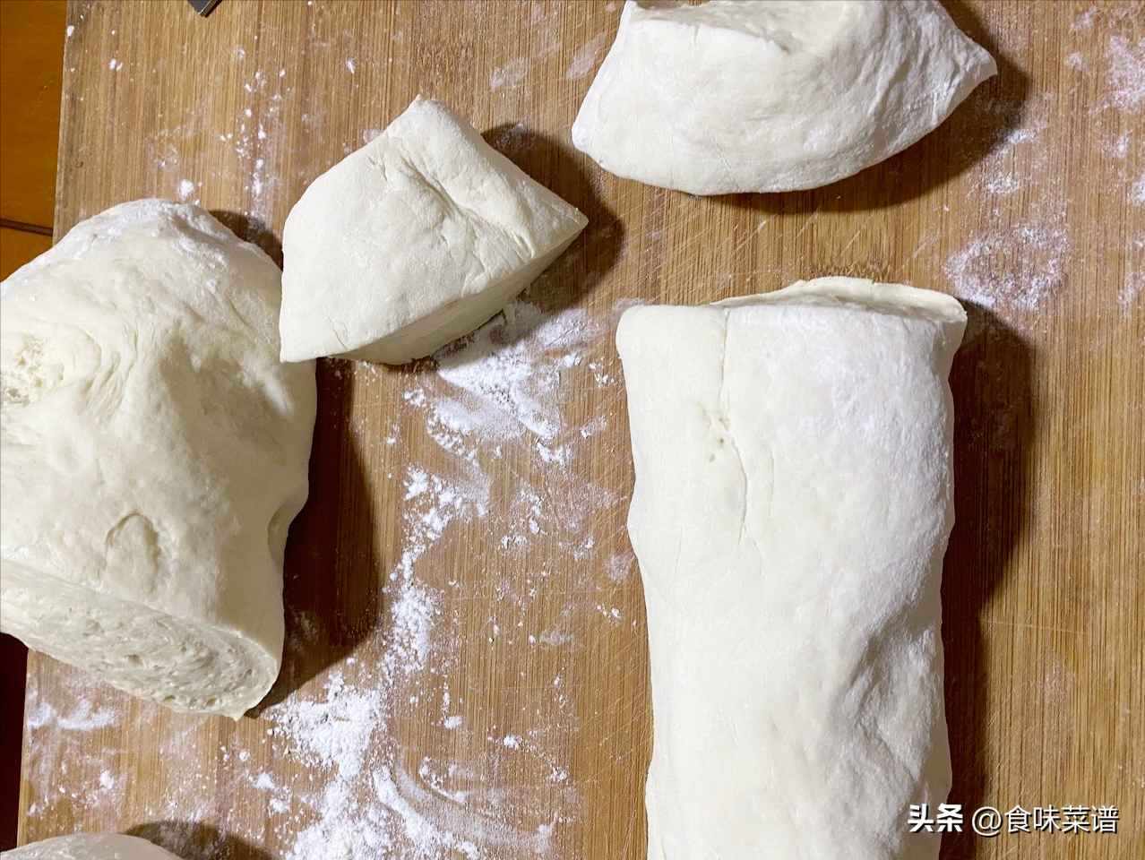 3、等时间到了,案板上撒些干面粉,防止粘连,把面团倒出来,揉搓排气,一定要有耐心,用力多揉一会儿,揉至中间没有气孔为止,搓成一根长条,再分成均等的面剂。