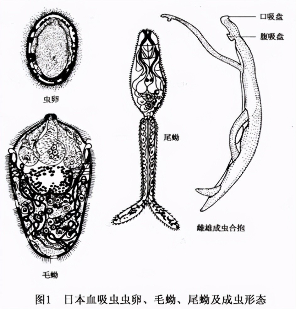 日本血吸虫虫卵、毛蚴、尾蚴及成虫形态