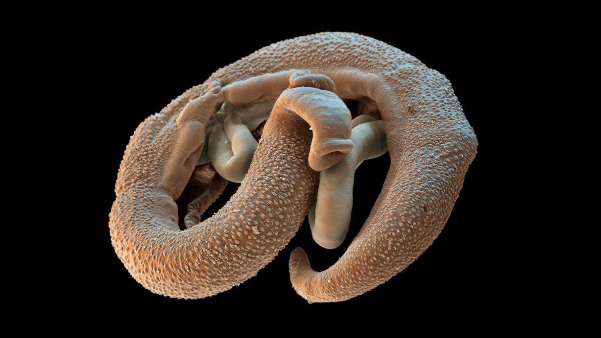 血吸虫为细条状,雌虫比雄虫更细一些,雄虫腹部有一条深沟,能够把雌虫完全包裹住。几乎每一条雄虫的怀里都抱着一条雌虫,而且一抱就是一辈子。在雄虫的头部有一个吸盘,专门用来吸取宿主的血液,同时它还要把血液喂给雌虫。