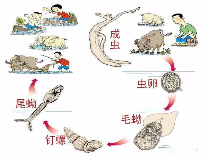 总结一下就是,虫卵从上一任宿主体内排除污染水质后孵化,找到中间宿主钉螺,经过一段发育时间后漂浮在水中寻找下一任宿主,感染后长成成虫完成一次传播循环。