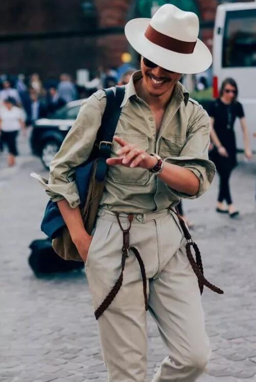 如果在衬衫上加上褶皱,再调成偏绿的色调,工装气息就很足了,再配上西裤和礼帽,随性又高级。