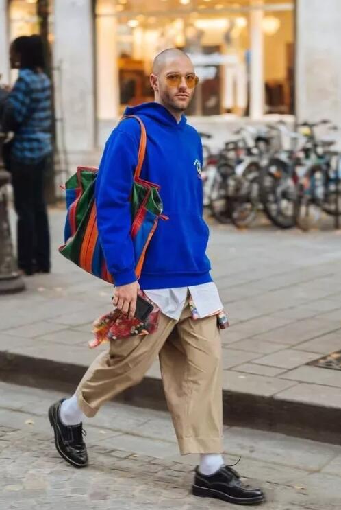 宝蓝色的视觉冲击力是很强的,在风格上比较偏街头嘻哈风一些,所以搭配时可以借助一些饰品,比如同样采用撞色设计的包款。