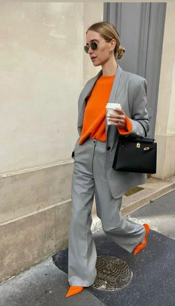 橙色用于上衣当中,也可以达到一样的出彩效果,但是它比100%橙色的配色容易驾驭一点,非常适合在日常生活中进行搭配。将橙色用于毛衣、西装外套或者是衬衫当中,利用好针织、西装料和丝绸材质,可以更好地增加色彩的优势,使其看上去高级又舒适,显得很有格调。