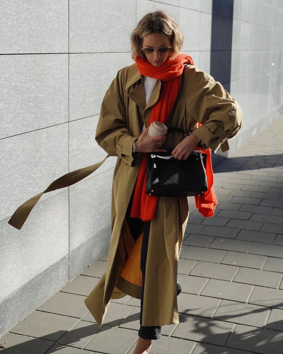 橙色用于配饰当中,可以起到一个决定性的作用,它不仅仅会成为画龙点睛的一笔,而且还能够提高女性的品位。当你的服装造型比较普通的时候,只需要搭配一条橙色围巾、挎上一个橙色包包、穿一双橙色平底鞋,就可以削弱沉闷感,让穿搭看上去更加摩登时髦。