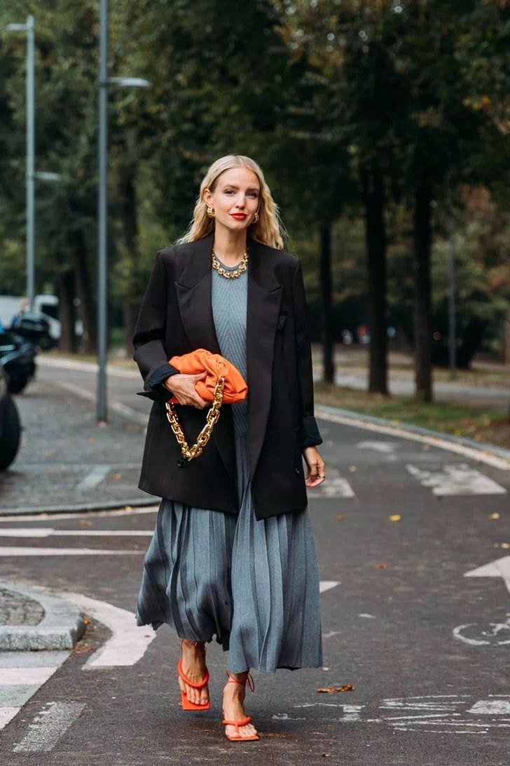 为了可以让造型看上去更加有层次感,还要学会利用好不同的面料进行组合,仅仅将橙色用于普通的面料上,是很难穿出高级感的,甚至会有一种廉价、俗气的既视感。建议大家可以多将橙色和皮革、缎面、毛呢、针织联系在一起,这样的话肌理感会更强一些,就算是用于长款的大衣外套上,也可以彰显出橙色的明媚气息。