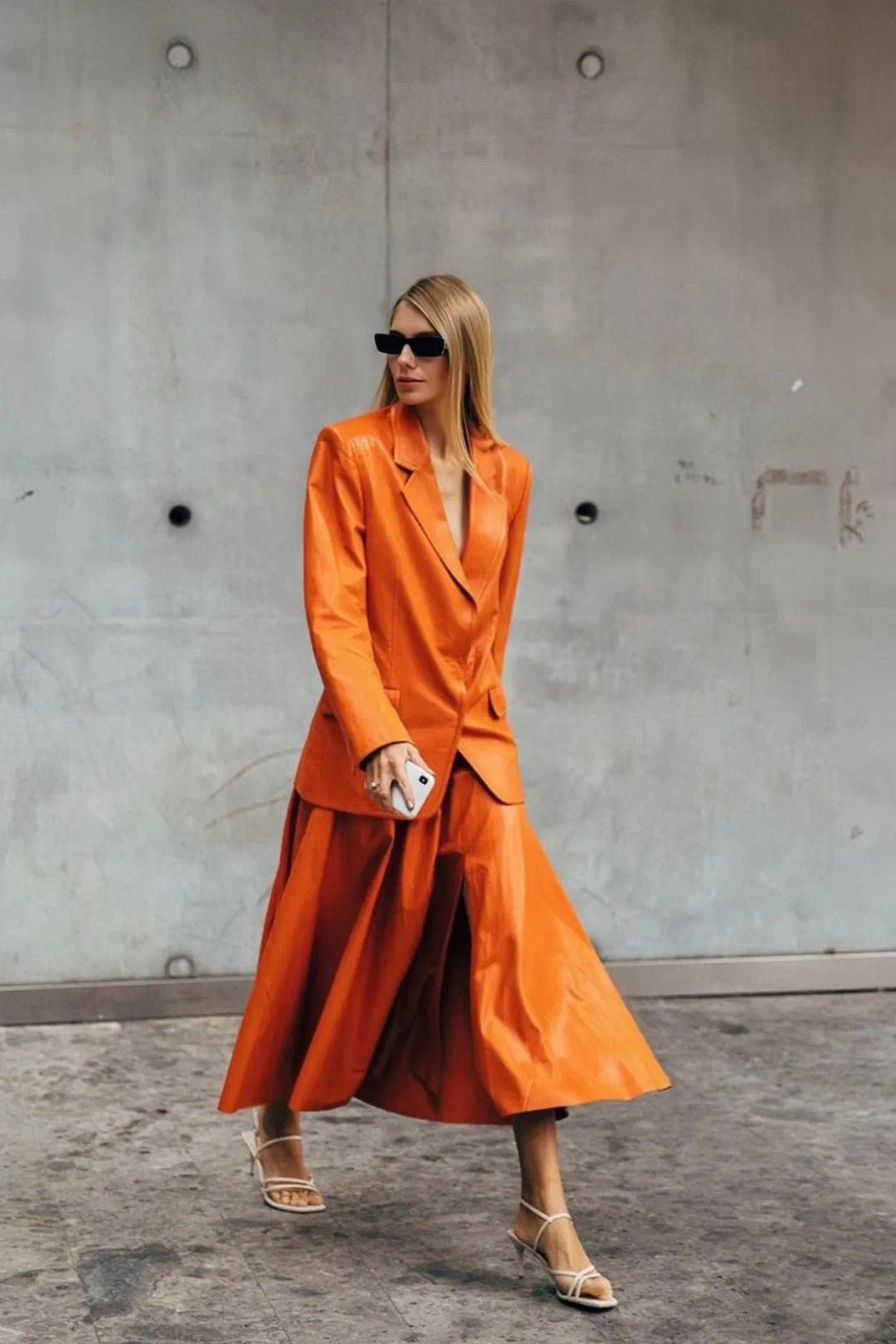 配色技巧一:100%橙色,立马成为焦点如果肤色允许的话,其实大家可以去大胆地尝试一下大面积的橙色覆盖,像这种橙色西装和半身裙的组合,走在街上立马就能够成为焦点。100%的橙色对于肤色的考验性还是挺高的,如果你的肤色足够白皙透亮的话,就可以轻易地hold住这抹橙色。