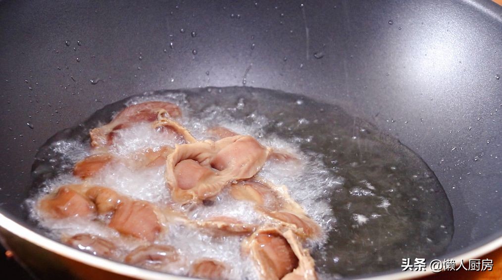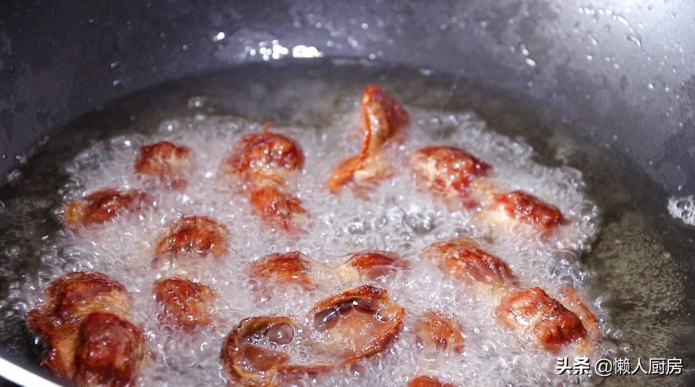 将沥好水分的鸡胗,倒入油锅内炸制,炸到鸡胗表面变得焦黄,捞出沥油。