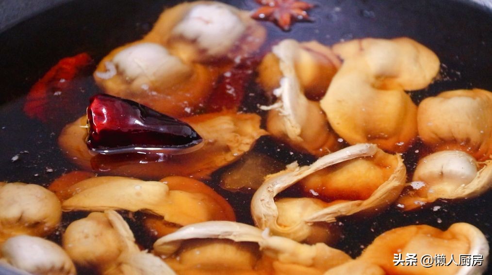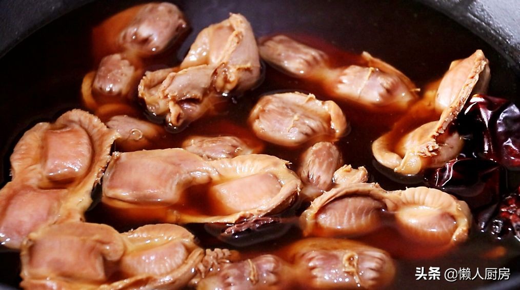 锅内重新倒水,放入姜片和葱,倒入一点生抽,几块冰糖,2勺盐,两根红干辣椒,一根桂皮,一个八角,把焯好水的鸡胗倒入锅内,开火卤制。