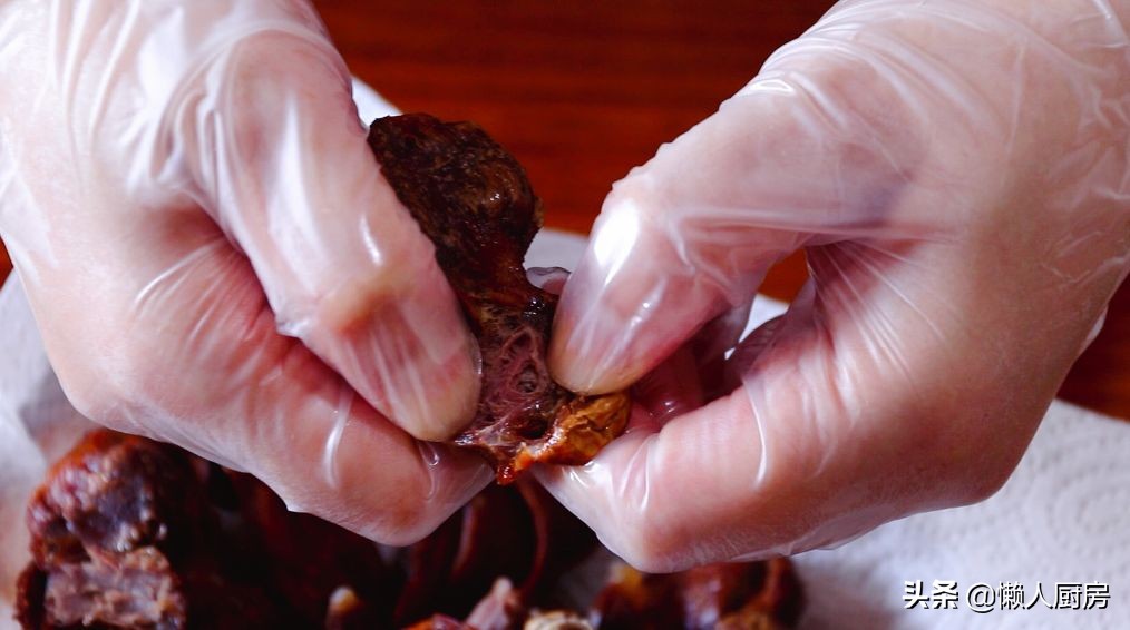 把炸好的鸡胗稍微晾凉一点,用手撕成小块。