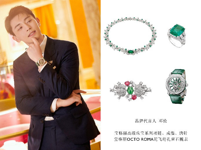 邓伦佩戴宝格丽高级珠宝系列项链、胸针、戒指及Octo Roma陀飞轮孔雀石腕表,彰显贵公子华丽风范。