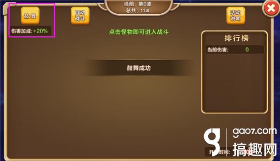 每次活动开启,都会评出输出前十名的玩家,想要进入前十,小编就教你们一些诀窍,首先,界面中左上角的【鼓舞】按钮,每次鼓舞需要花费一些绑钻……鼓舞最高可以增加200%的伤害结果加成,鼓舞在手,排行我有呀!!