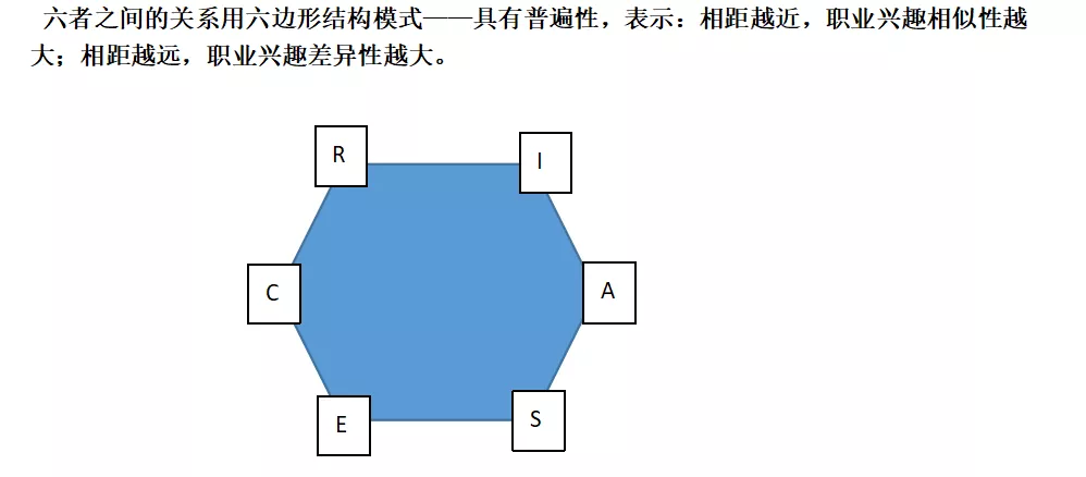 以上是霍兰德的职业人格分类。物以类聚人以群分,六种人格特质的个体造就了从业环境,因此,环境在霍兰德这依然分成这六种类型,而且霍兰德的六边形结构之间有相互关系: