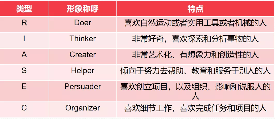 分别是行动者对应现实型、思考者对应研究型、创造者对应艺术型、助人者对应社会型、说服者对应企业型、组织者对应传统型。