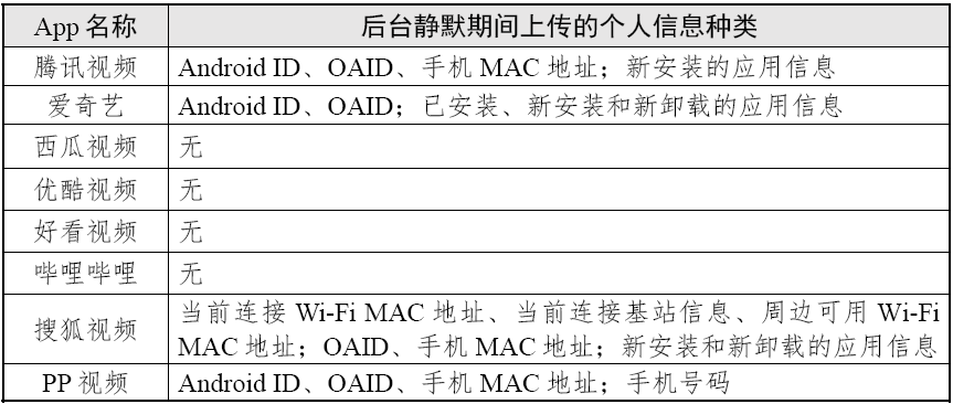 (5)在后台静默场景中,个人信息上传种类最多的为搜狐视频(3类)。具体情况如表11。