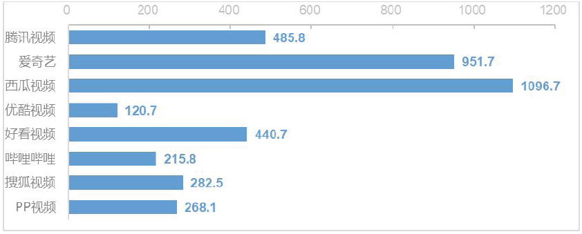(1)8款App在用户完成一次在线影音搜索播放活动(启动App、搜索音视频、播放音视频、发送弹幕评论)时,上传数据流量平均?3?最多的为西瓜视频,约为1097KB;平均最少的为优酷视频,约为121KB。具体情况如图1。