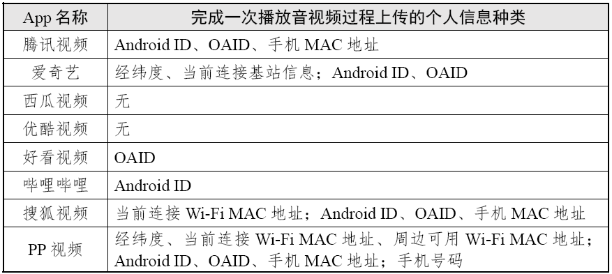(3)在播放音视频场景中,个人信息上传种类最多的为PP视频(3类)。具体情况如表9。