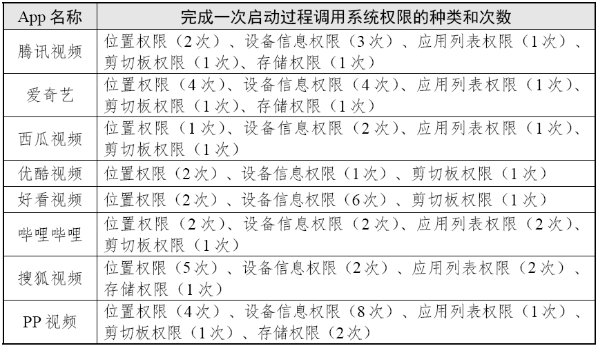 (1)在启动App场景中,调用系统权限种类最多的为腾讯视频、爱奇艺、PP视频(均为5类),调用系统权限次数最多的为PP视频(16次)。具体情况如表2。