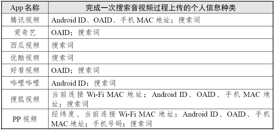 (2)在搜索音视频场景中,个人信息上传种类最多的为PP视频(4类)。具体情况如表8。