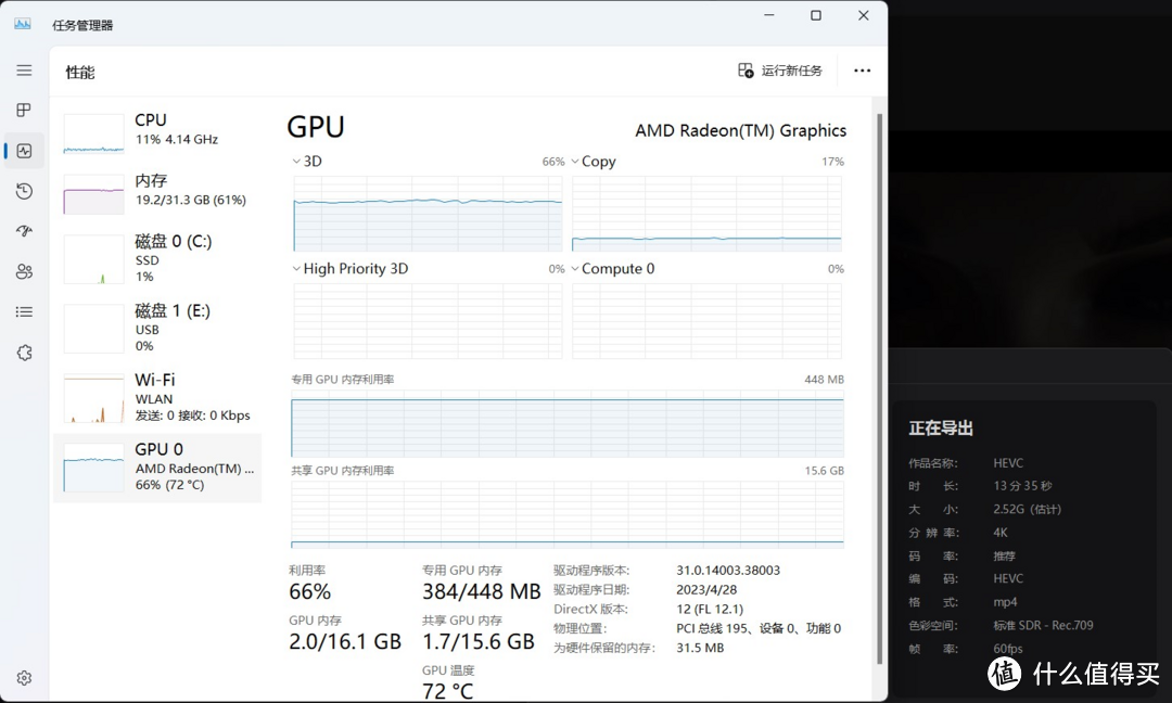 亲测剪映专业版HEVC/h.264视频导出时支持Radeon 780M显卡加速,剪辑低规格(4K60)、少轨道的视频也基本够用。