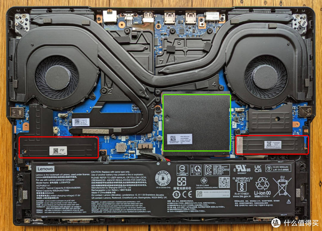 游戏本普遍有着双硬盘插槽(图中红色框处),出厂预装一根硬盘,后续用户可以自行添加硬盘。有的游戏本支持硬盘RAID阵列,但是PCIe4.0的固态性能已经很棒而且容量单价很低,私以为组RAID提速不如购买大容量固态扩容。