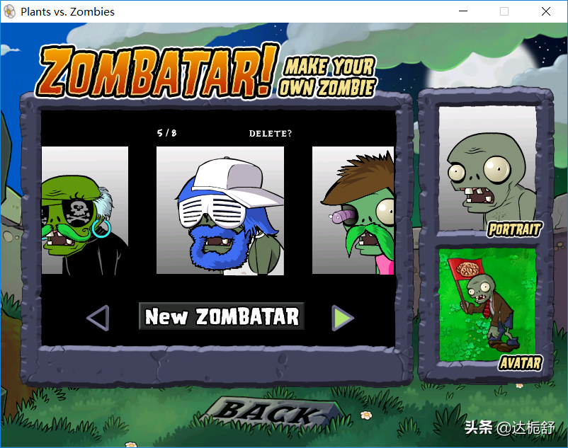 当之无愧的肯定是zombatar!(游戏中的标题),也就是能制作属于自己的僵尸。我们都知道在每一波僵尸进攻时都有一个领头的僵尸,所谓的make your own zombie(游戏中的英文)就是装扮这个拿着印有脑子的领头军,可以任意搭配的选项也是种类繁多,从皮肤到发型,从胡子到有趣的装饰,不仅款式各异,颜色也是任意搭配,每次在玩游戏时会随意出现已经装扮好的领头僵尸,也算是提高了可玩度。保存形象之后也会在桌面上生成一张类似于头像的自己定制的DIY僵尸图片,大家可以当作头像也是挺好玩的。