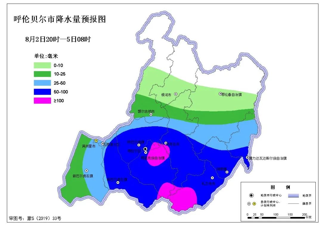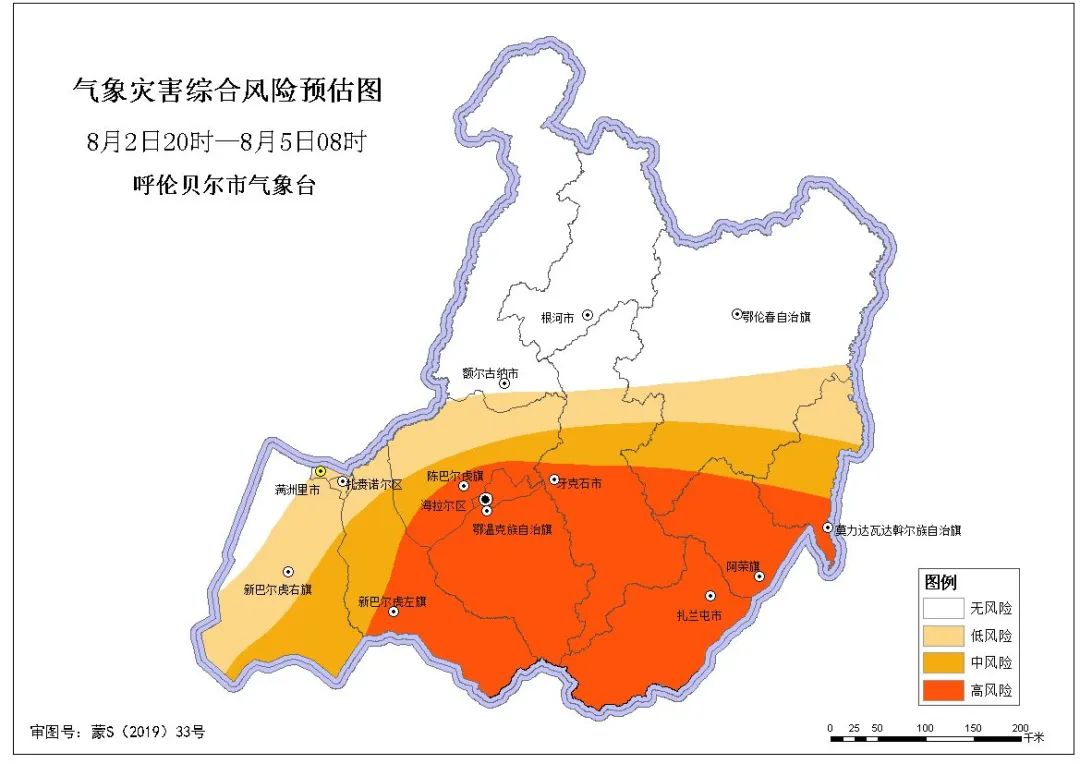 受高空槽影响,预计8月2日夜间至4日夜间,我市南部大部地区有中风险暴雨灾害,其中海拉尔区、陈巴尔虎旗南部、鄂温克族自治旗、新巴尔虎左旗南部、牙克石市南部、扎兰屯市、阿荣旗大部和莫力达瓦达斡尔族自治旗南部有高风险暴雨灾害;西部偏西和北部偏南有低风险暴雨灾害。