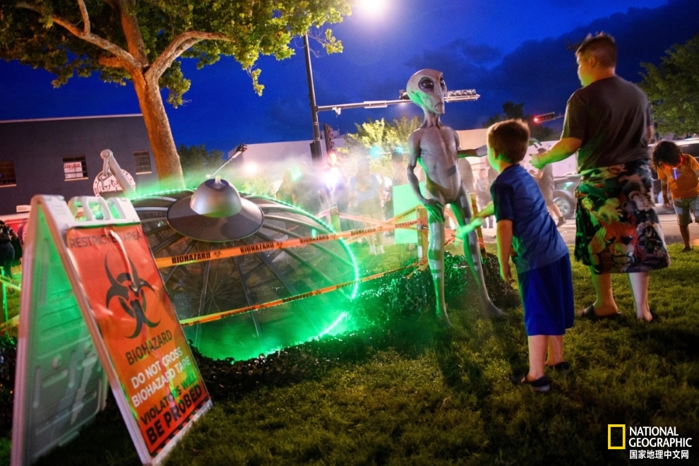 2021年7月2日,在新墨西哥州罗斯韦尔的外星人节上,人们与外星人雕像合影。尽管美国政府声称数十起不明飞行物目击事件无法解释,但三分之一的美国人告诉盖洛普民意测验专家,他们愿意相信外星人存在。摄影:PATRICK T. FALLON,AFP/GETTY IMAGES