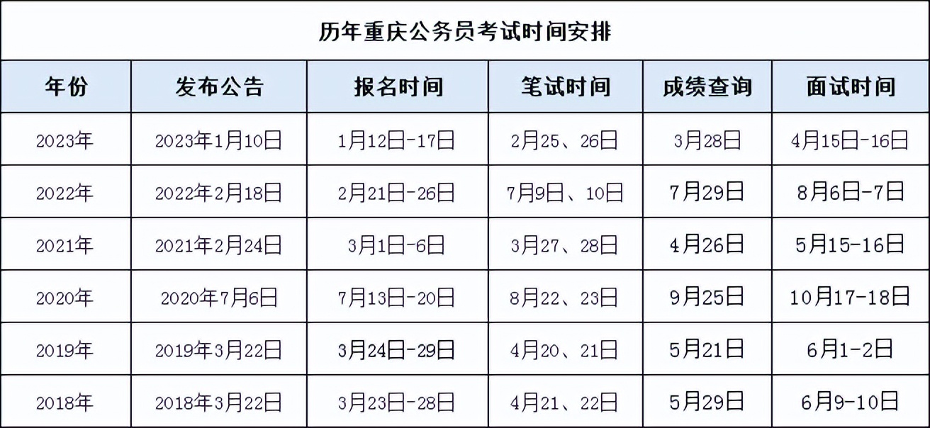 参考近几年考试时间,除了2020年因新冠疫情影响推迟至7月份启动,其它年份考试时间一直比较稳定,而且每年都参加多省公务员联考。由此推测:2024年重庆公务员考试预计会在2024年1-2月份启动,具体时间以官方发布的公告为准。