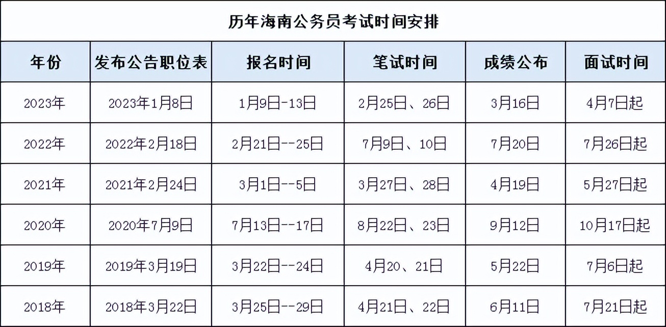 2024年海南公务员考试时间尚未确定。参考上表,除了2020年因疫情原因推迟至7、8月份举行,其他年份海南公务员考试时间比较稳定。且近年来都参加了多省公务员联考,笔试时间与联考时间一致。2024年海南公务员考试公告预计会在2023年1-2月左右发布,参加多省公务员联考。