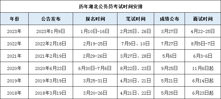 参考近几年考试时间,除了2020年因新冠疫情影响推迟至8月份举行,其它年份考试时间一直比较稳定,而且每年都参加多省公务员联考。由此推测:2024年湖北公务员考试预计会在2022年1-2月份启动,具体时间以官方发布的公告为准。