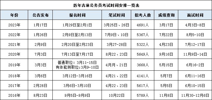 除了2020年因疫情原因推迟至7、8月份举行,其他年份吉林公务员考试时间比较稳定,报名集中在2-3月份。且近几年多次参加了公务员联考,笔试时间与联考时间一致。2024年吉林公务员考试公告预计会在明年2-3月左右发布,参加多省公务员联考。