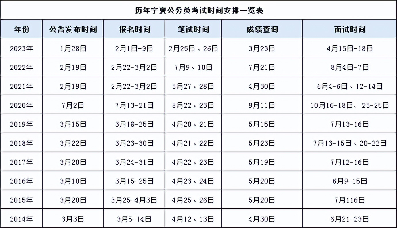 从以上表格来看,近几年宁夏区考都参加了多省公务员联考。如果2024年宁夏区考继续参加联考,公告职位表预计会在2023年1-2月份发布。2-3月份笔试。准确时间还要以2024年宁夏区考公告为准。