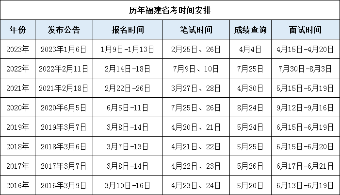 参考近几年考试时间,除了2020年因新冠疫情影响推迟至7月份启动,其它年份考试时间一直比较稳定,而且每年都参加多省公务员联考。由此推测:2024年福建公务员考试预计会在2024年2-3月份启动,具体时间以官方发布的公告为准。