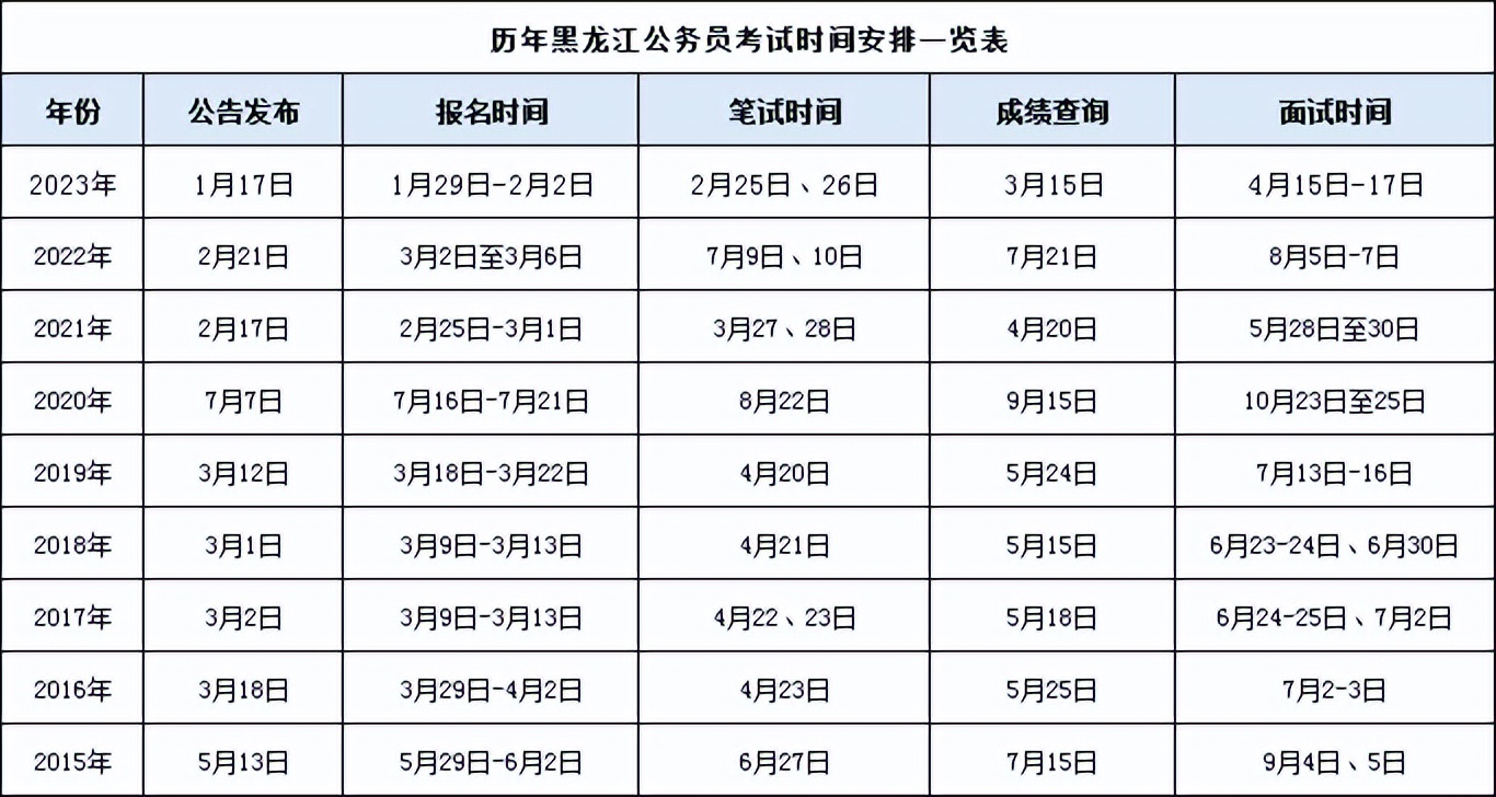 从以上表格来看,近几年黑龙江省考都参加了多省公务员联考。如果2024年黑龙江省考继续参加联考,公告职位表预计会在2023年1-2月份发布。2-3月份笔试。准确时间还要以2024年黑龙江省考公告为准。