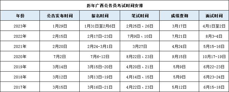除了2020年因疫情原因推迟至7、8月份举行,其他年份广西公务员考试时间比较稳定,报名集中在2-3月份。且近几年多次参加了公务员联考,笔试时间与联考时间一致。2024年广西公务员考试公告预计会在明年2-3月左右发布,参加多省公务员联考。