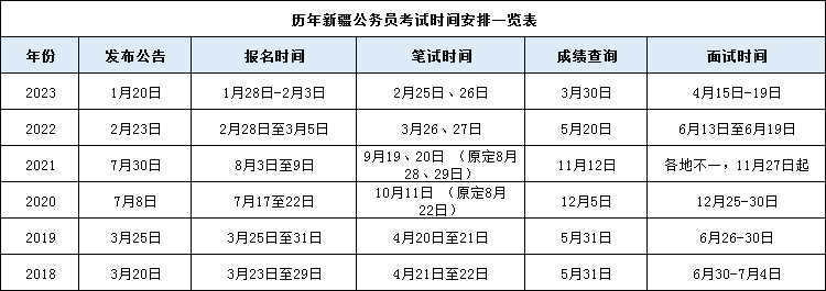 从以上表格来看,近几年新疆区考都参加了多省公务员联考。如果2024年新疆区考继续参加联考,公告职位表预计会在2023年1-2月份发布,2-3月份笔试。准确时间还要以2024年新疆区考公告为准。