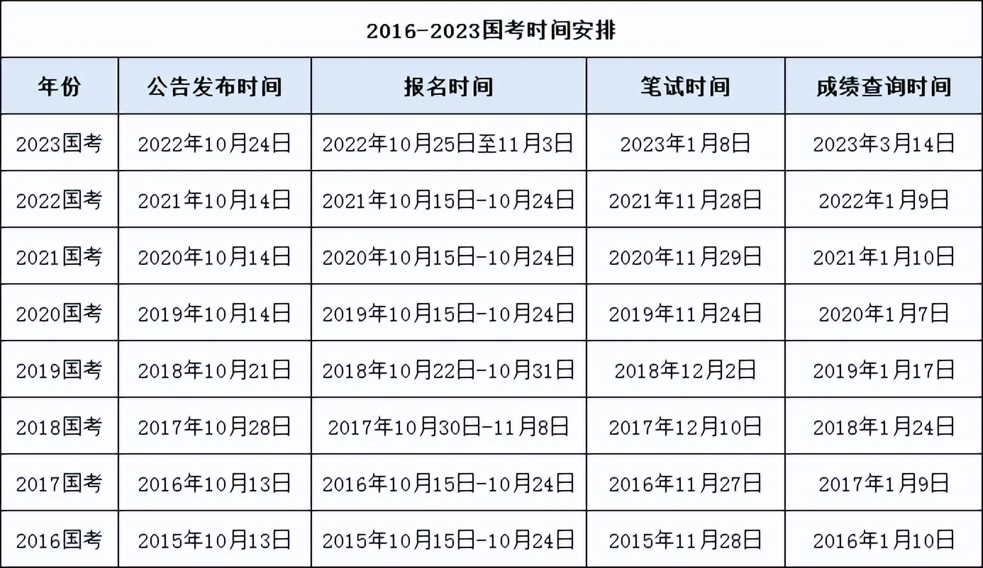 查看往年国考时间安排,发现相差不大:公告会在报名前一两天发布,笔试时间主要集中在11月最后一个周末或12月第一个周末举行。(具体请以最新公告为准)