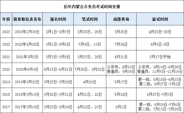 参考近几年考试时间,除了2020年因新冠疫情影响推迟至7月份启动,其它年份考试时间一直比较稳定,而且每年都参加多省公务员联考。由此推测:2024年内蒙古公务员考试预计会在2024年2-3月份启动,具体时间以官方发布的公告为准。